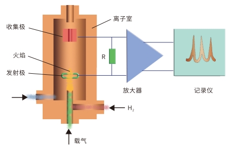🔯 氢火焰离子化检测器(FID),它是典型的破坏性、质量型检测器、是以氢气和空气燃烧生成的火焰为能源,当有机化合物进入以氢气和氧气燃烧的火焰,在高温下产生化学电离,电离产生比基流高几个数量级的离子,在高压电场的定向作用下,形成离子流,微弱的离子流经过高阻放大,成为与进入火焰的有机化合物量成正比的电信号,因此可以根据信号的大小对有机物进行定量分析。
