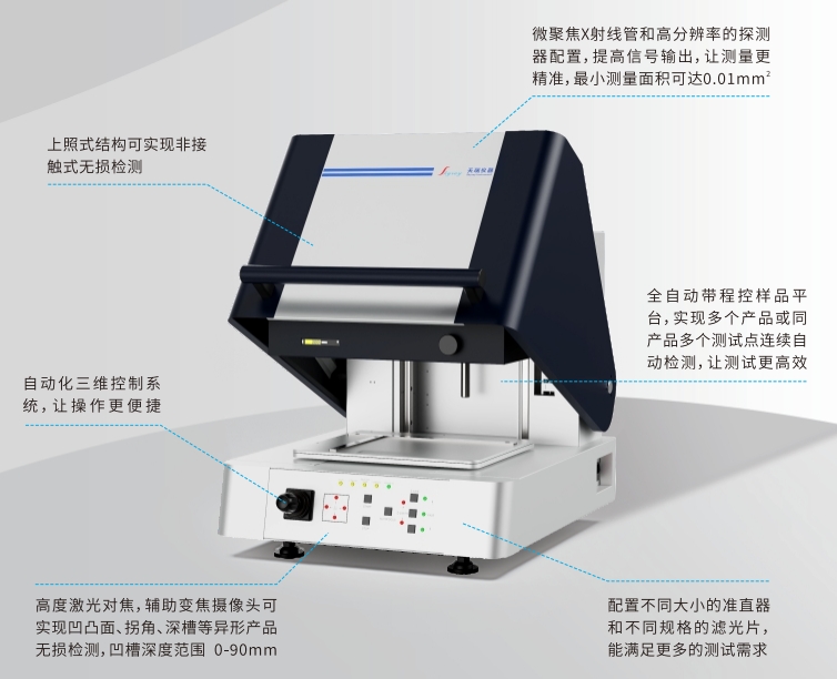 EDXThick800是一款全新上照式多功能自动微区X荧光膜厚测试仪,既满足原有微小和复杂形态样品的膜厚检测功能,又可满足有害元素检测及轻元素成分分析;搭载自动化的X/Y/Z轴的三维系统、双激光定位和保护系统,可多点位编程测试,被广泛应用于各类产品的质量管控、来料检验和对生产工艺控制的测量。
