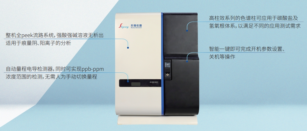 TIC-680离子色谱仪是天瑞仪器在TIC-600的基础上,推出的全新一款具有双极电路、电磁阀进样、可搭载自动淋洗液发生器、同时可兼容安培检测器、紫外检测器等,满足不同的样品测试需求。该款产品搭载淋洗液自动发生器可实现梯度洗脱,满足新国标GB5750.10-2023生活饮用水中消毒副产物的测定;除此之外该产品既能满足常规阴离子、阳离子、氰根及小分子有机酸的分析,也能与AFS、ICP、ICP-MS联用进行形态分析;普遍适用于环境、疾控、食品、电子、化工、医药、矿冶等领域。