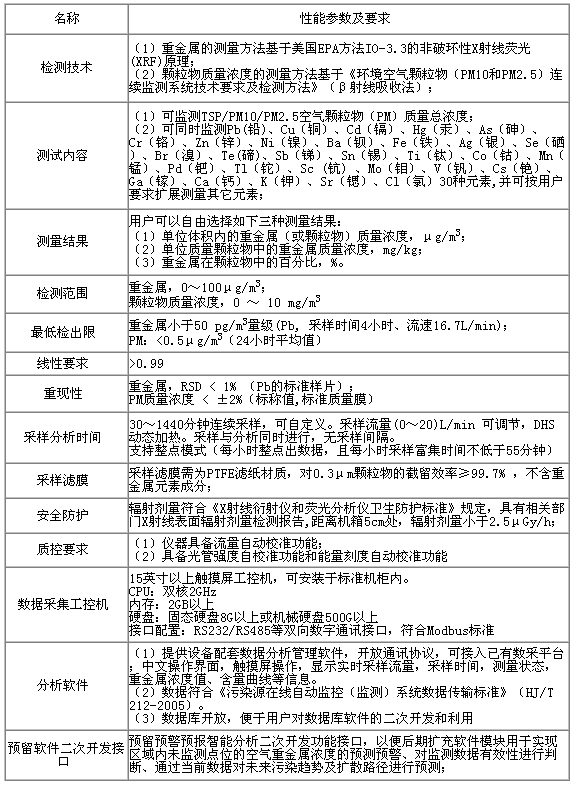 (4)铅、铁、镉、铬、砷等30种重金属含量测量,探测灵敏度10pg/m3量级,重金属元素可扩展。