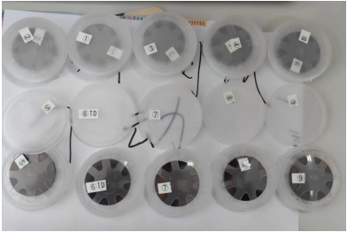 按照石墨取样标准,取100g石墨样品,在105℃的干燥箱干燥2h。称量10.0g石墨样品和2.0g硬脂酸(分析纯)于粉碎机中振动研磨30s,将石墨样品粉碎至0.074mm及以下。称量3.0g石墨样品和12.0g硼酸粉末,以硼酸粉末为填充剂,在30T压力保压30s的条件下压片成型。然后,在样片上面贴上标签、放入样品袋中,待用。
