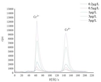 依次进样测试0.2 µg/L、0.5 µg/L、1 µg/L、3 µg/L、5 µg/L Cr3+和Cr6+混合标准溶液,分离度R>1.5,完全分离。