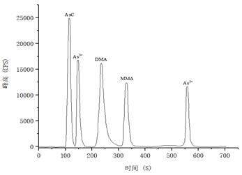 图4. 5.0µg/L三种砷体型的相混标淮盐溶液色谱图 3.5.4 测式效果 池水打样定制及加标1µg/L的测式没想到详细表4,打样定制及加标后砷行态累加谱图如图甲如图是5如图是。                          表4   备样中各砷体型的测试测试的结果