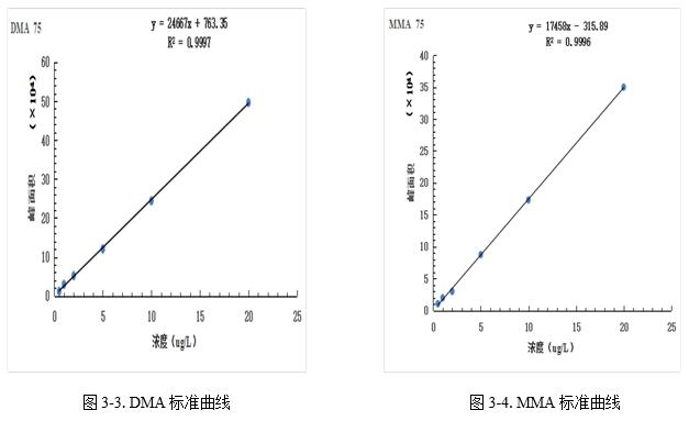 按照混合标准溶液浓度0.5µg/L、1.0µg/L、2.0µg/L、5.0µg/L、10.0µg/L、20.0µg/L进样得到色谱图,计算其峰面积,以浓度和峰面积绘制标准曲线,线性相关系数均大于0.999,结果详见图3-1~3-5。