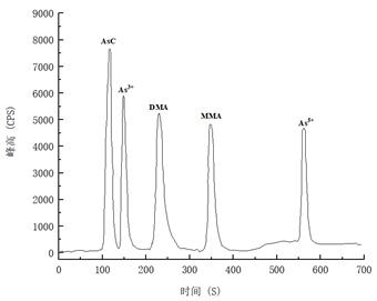 按表2的洗脱条件,进样20.0µg/L砷形态混合标准溶液,得到五种砷分离色谱图,如图2。AsC、As3+、DMA、MMA、As5+相对保留时间分别为120s、155s、247s、329s、583s,总分离时间约为600s。