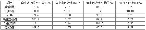 在纯净水和江水添加入0.5ug 6种有机化学磷混标,分辨作第三次抛物线样,按处里样本的步骤开展样本前处里,GC-MS 6800软件测试,利用外标发定量,计算出其环保再生资源回产出率,大数据见下表: