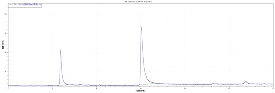 目标物在5ppm-100ppm线性良好。取空白食品样品加标,样品经过正己烷和乙酸乙酯(1+1)超声萃取。20ppm加标水平下谱图如下,得到了比较满意的效果。